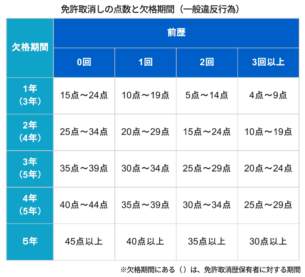 | 酒気帯び運転 | 35点 | 5年または更に長い | 免許取消し対象、刑事処分あり |